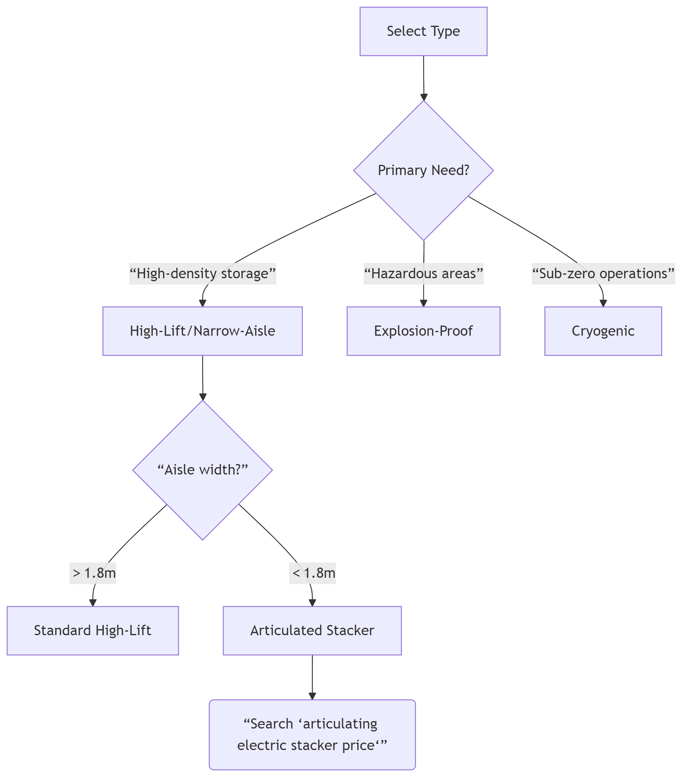 प्रकार Aisle Width Target Keyword Tri-Directional 1.6-1.8m "tri-directional electric stacker"Articulated 1.4-1.6m "articulating narrow reach truck"3. Explosion-Proof Electric Pallet Jacks